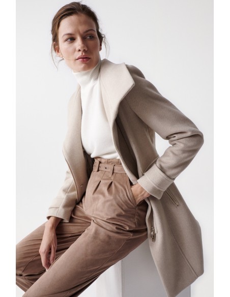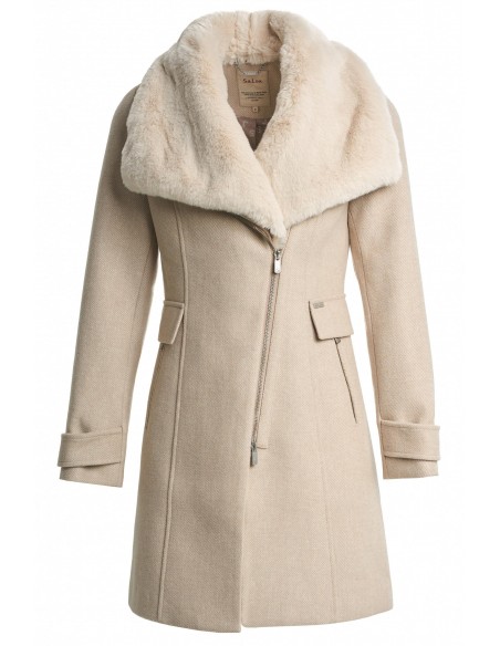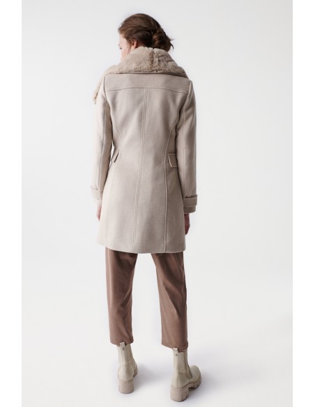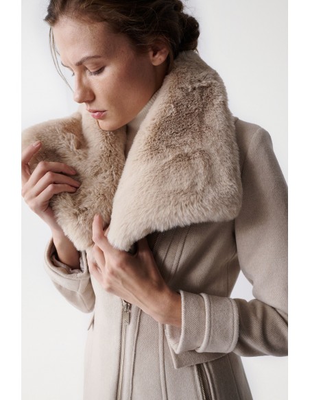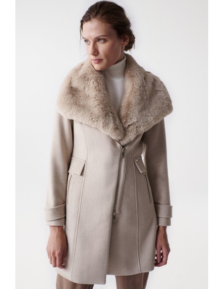 Abrigo de paño con pelo sintético desmontable en el cuello.