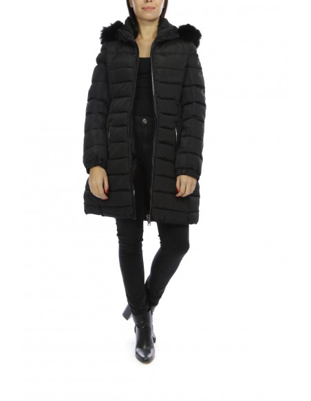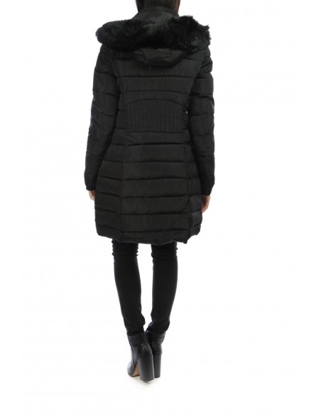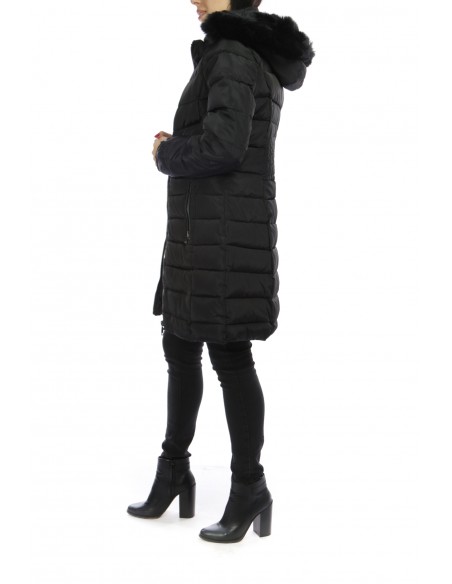 Abrigo largo con puños ajustables y capucha con detalle de pelo.