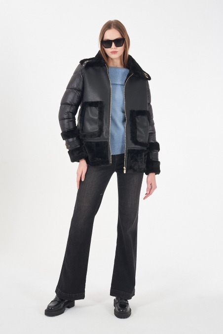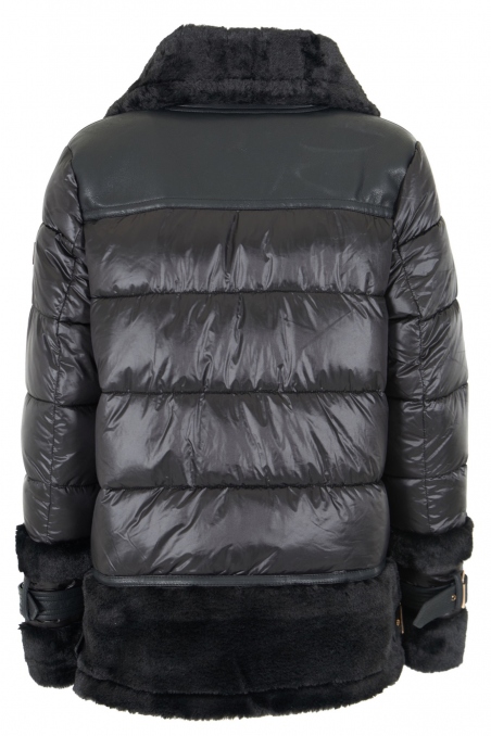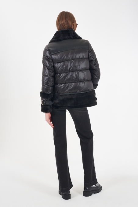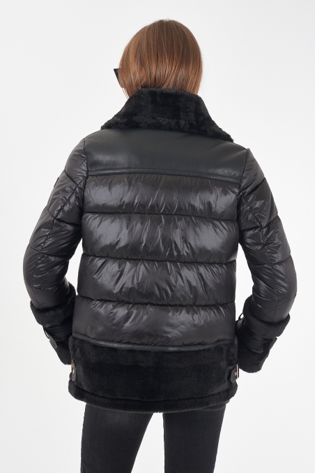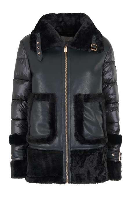 Descubre la elegancia atemporal de nuestro abrigo acolchado combinado con polipiel y los detalles de pelo.