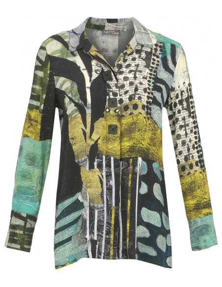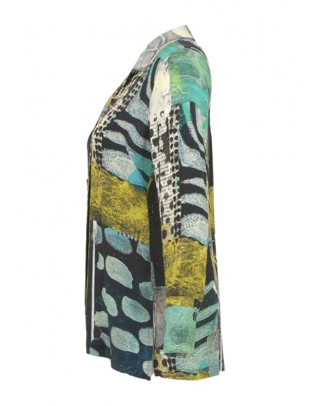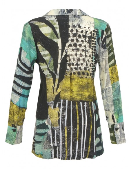 Blusa de diseño abstracto que combina colores vibrantes y formas únicas, ideal para quienes buscan un estilo moderno y original.