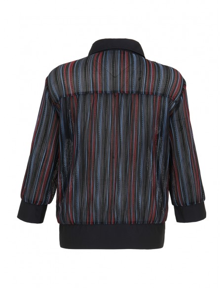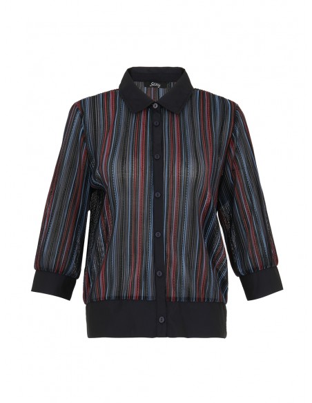 Esta camisa de rayas azules, negras y rojas es perfecta para quienes buscan un estilo moderno y atrevido.