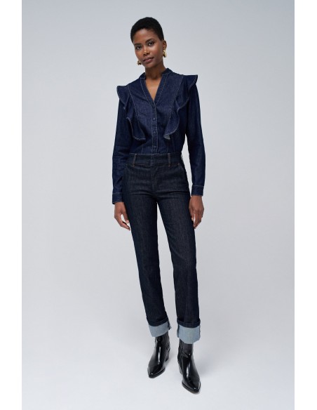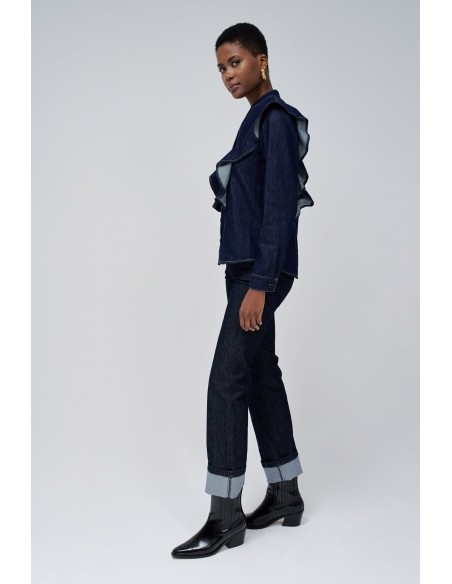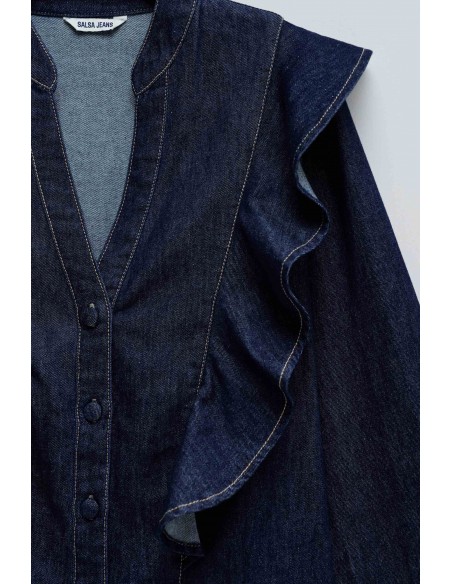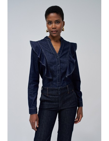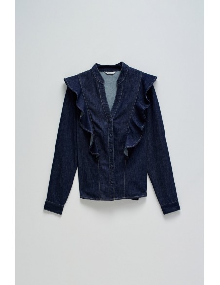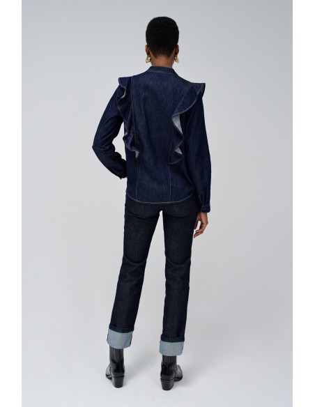 En azul índigo, cuenta con cierre de botones y manga larga con puños abotonados, perfecta para looks formales o desenfadados.