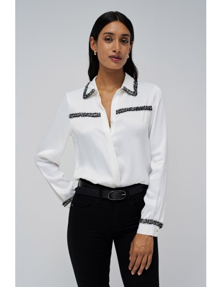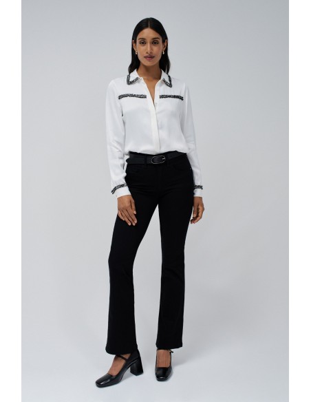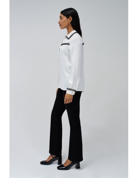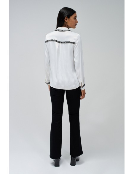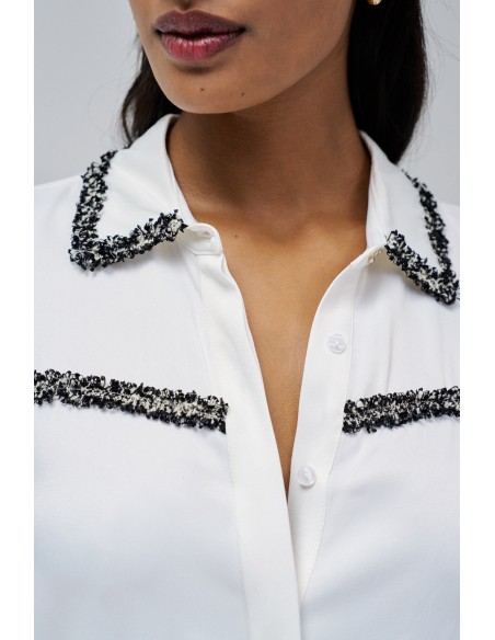 Los detalles de tweed contrastan con la suavidad del tejido satinado, lo que crea una elegante y original fusión de texturas.