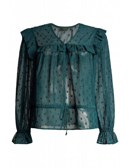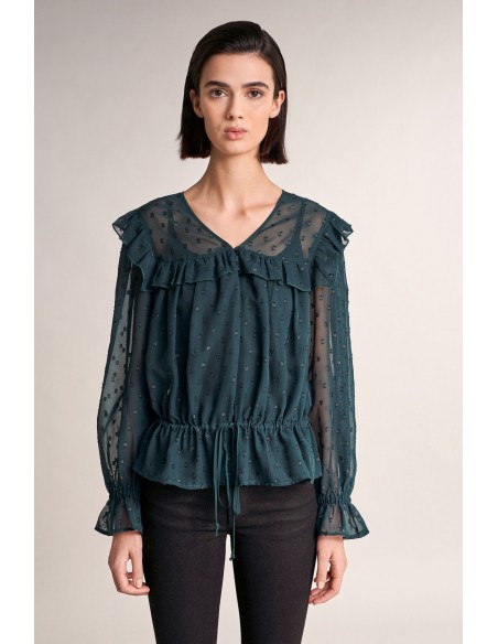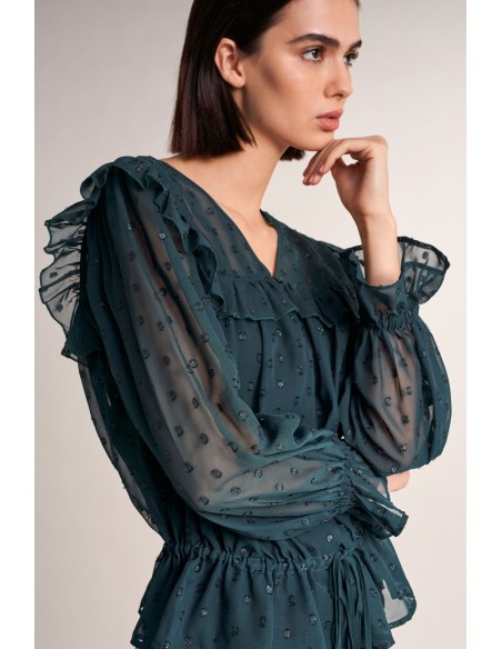 BLUSAS Y CAMISETAS BLUSA AZUL VOLANTES Tiffosi 10039571 733 18,19 € 25,99 € Blusa de manga corta y cuello redondo con detalle de volantes y elástico tipo nido de abeja. Lazos en cuello y mangas. Color: Azul Comprar