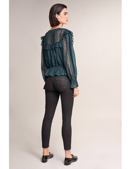OUTLET CAMISA SATINADA NEGRA Salsa Jeans 21007131 000 41,97 € 59,95 € Camisa de manga larga con cuello solapa. Escote a pico. Corte slim. Cierre frontal con botones. Detalle de cinta ajustable en la espalda. Manga con puño camisero y botones. Tejido satinado estampado en pata de gallo. Color: Negro Comprar