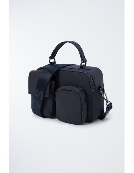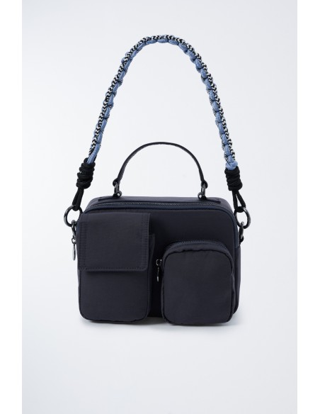 Bolso azul multibolsillos acolchado de nailon reciclado.