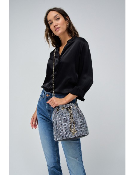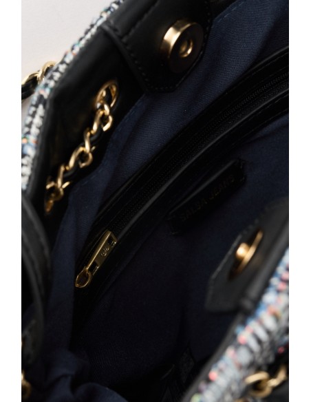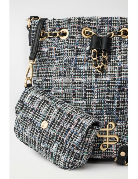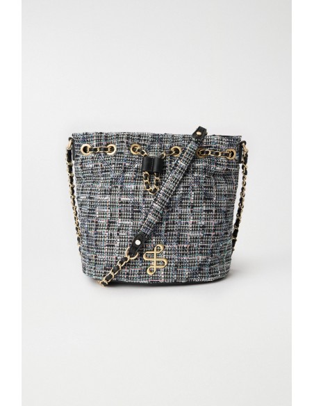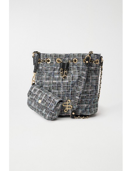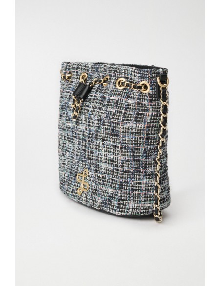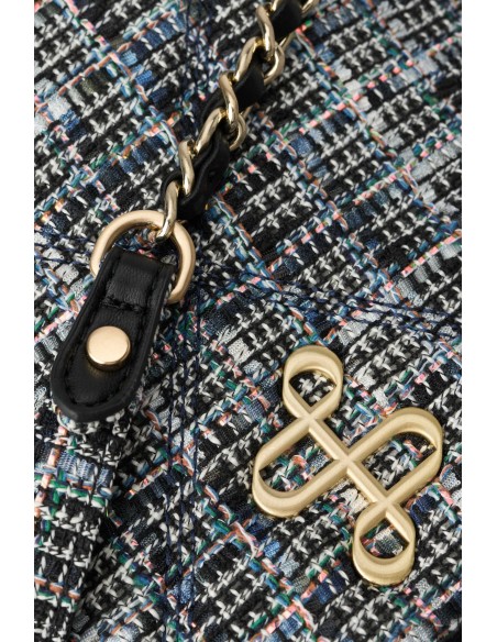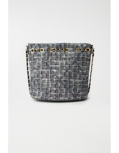 Este bolso en tweed azul y blanco es el complemento perfecto para cualquier outfit.