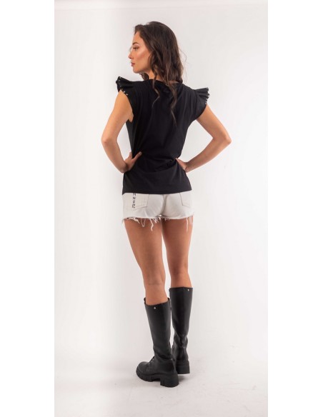 Detalle de estrella en tul negro sobre el pecho.