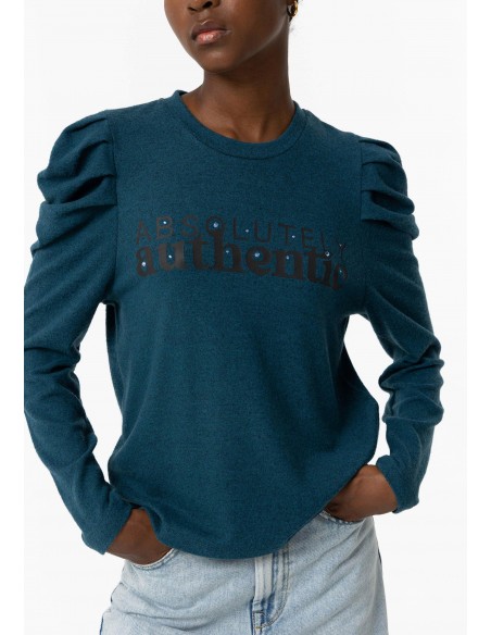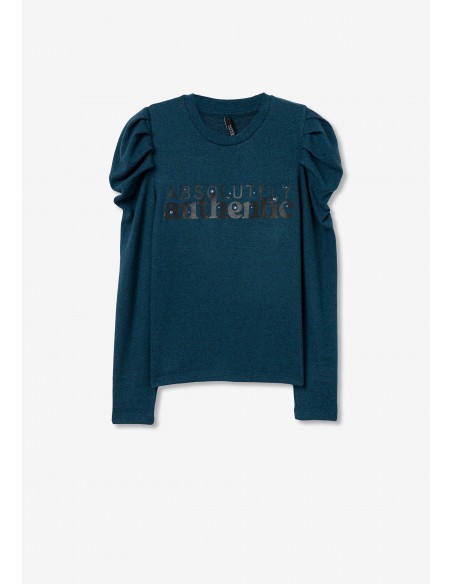 Descubre la comodidad y el estilo con esta camiseta de hombros abullonados azul que dice "absolutley authentic".