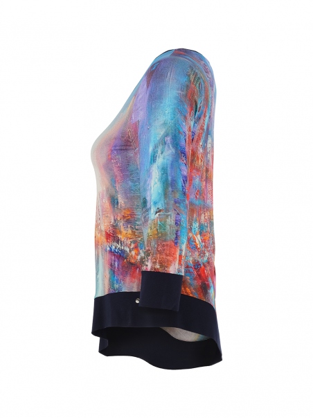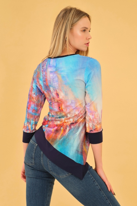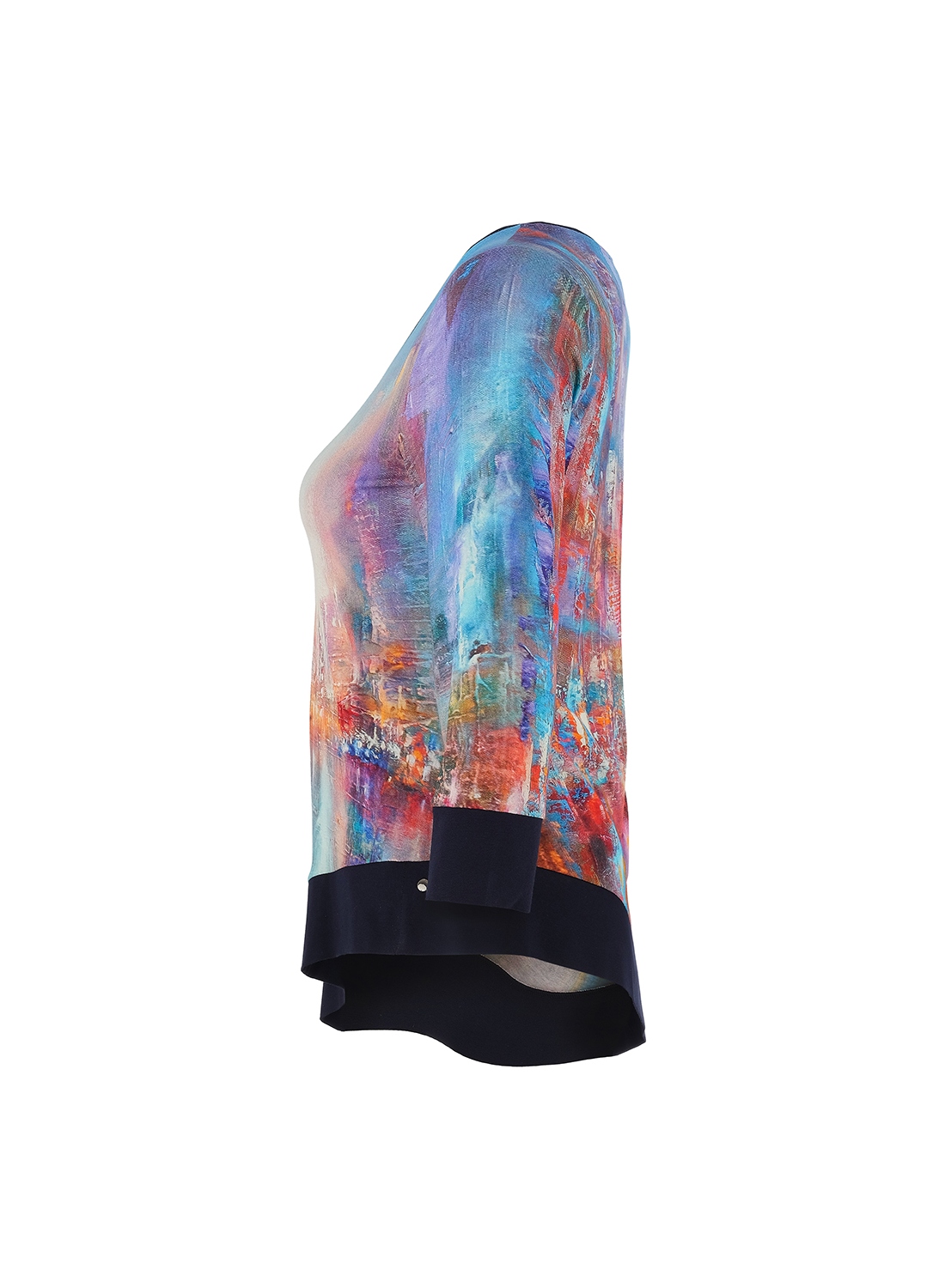 Esta prenda única no solo destaca por su vibrante estampado artístico, sino que también está confeccionada con una mezcla de tejidos suaves que garantizan comodidad durante todo el día.
