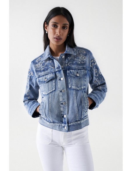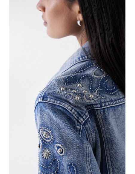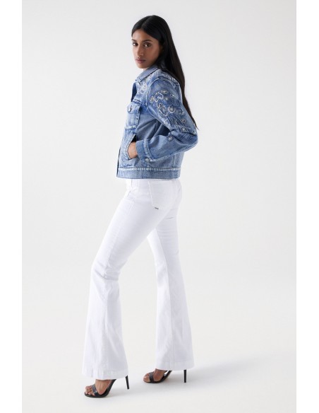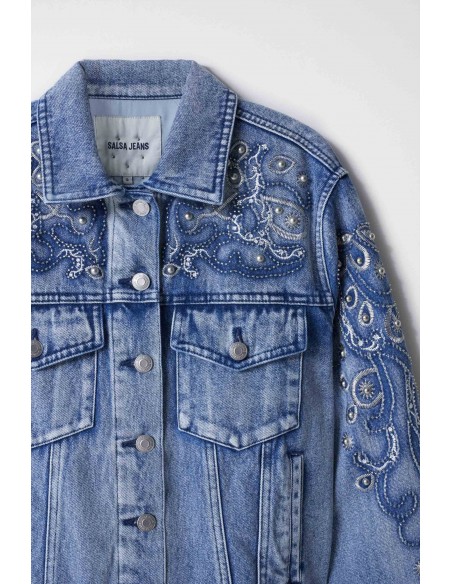 CAZADORAS CAZADORA DENIM PEDRERIA Flamenco Rosa PA1482 109,65 € 129,00 € Cazadora vaquera corta de fit slim en denim claro. Dos bolsillos en el pecho. Cierre con botones. Detalle de bordados, flecos y pedrería. Forro interior estampado. Color: Azul Comprar