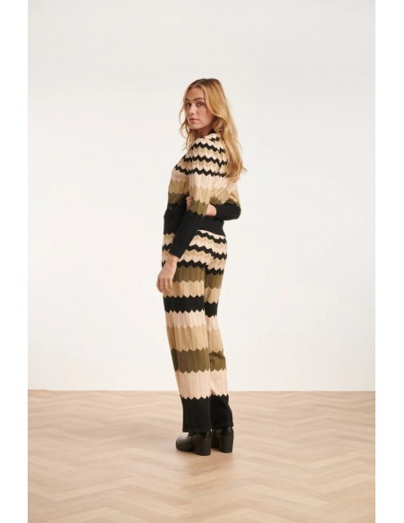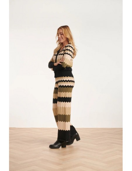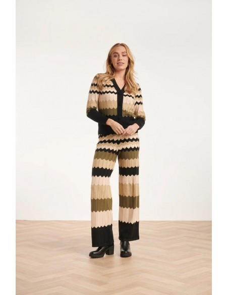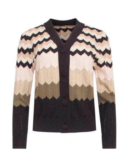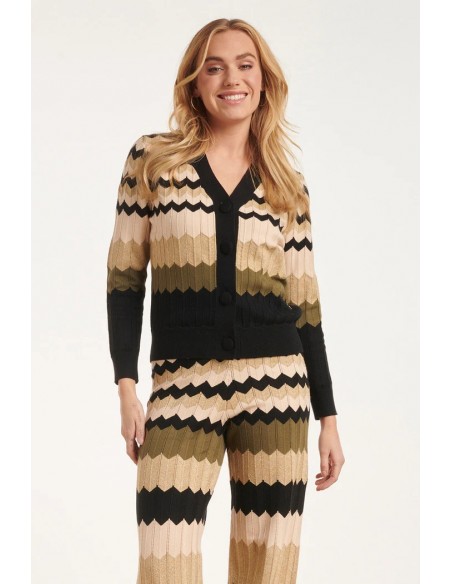 Este elegante cárdigan en una combinación de colores neutros de arena, dorado, verde militar y negro es perfecto para cualquier ocasión.