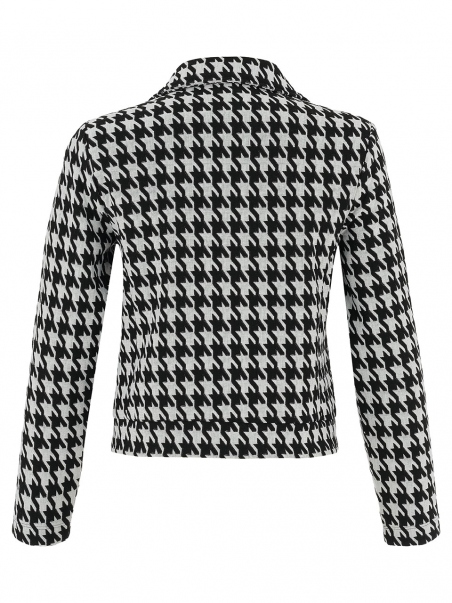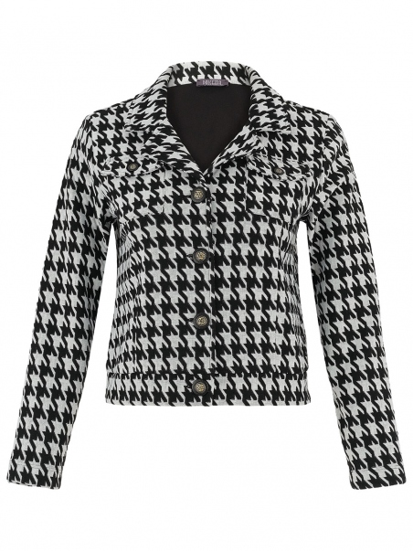 Dale un toque clásico y elegante a tu guardarropa con esta chaqueta de pata de gallo en blanco y negro.
