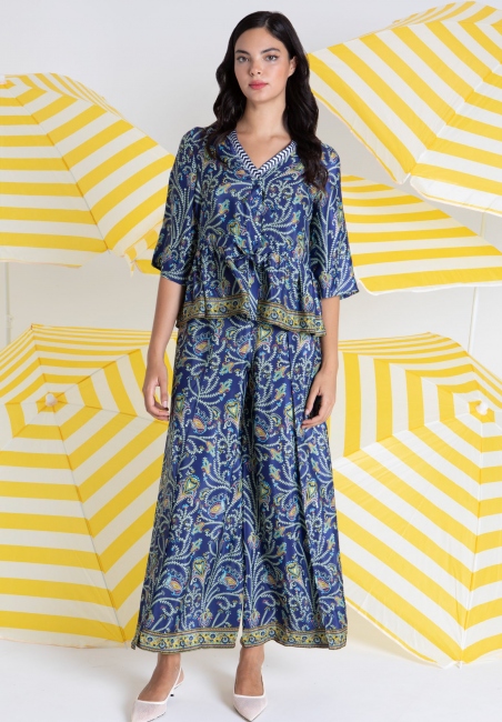 Este pantalón azul de estampado paisley es la elección perfecta para destacar en cualquier ocasión.