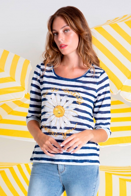 Dale un toque fresco a tu armario con nuestra camiseta de rayas con diseño de margaritas.