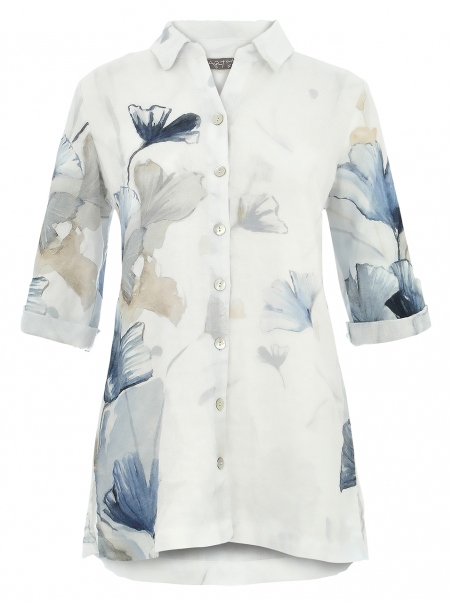 Descubre la elegancia y frescura de nuestra camisa blanca estampada con delicadas flores azules.