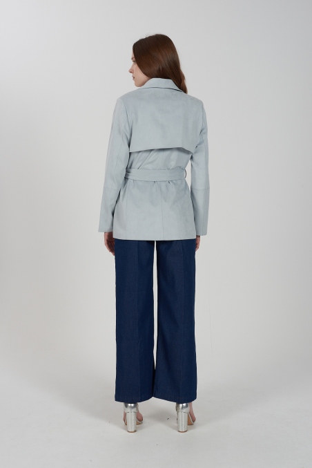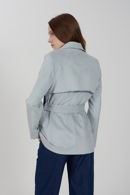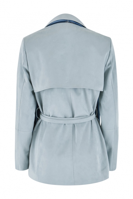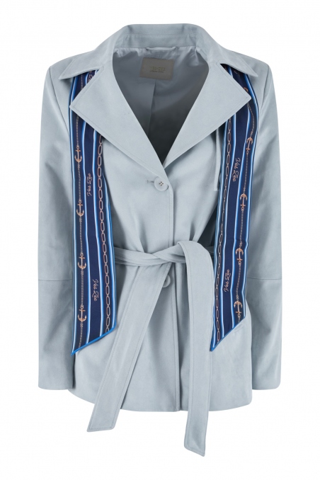 Dale un toque fresco a tu outfit con esta gabardina corta azul con pañuelo de estilo marinero.