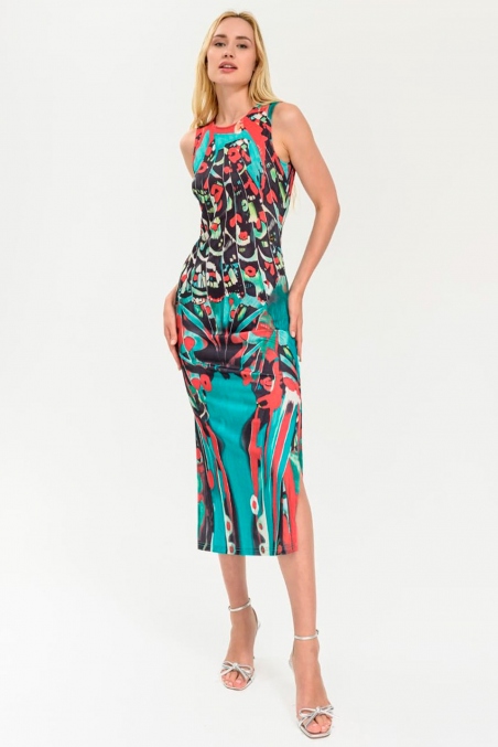 Dale un toque vibrante a tu look con este espectacular vestido midi de estampado multicolor.