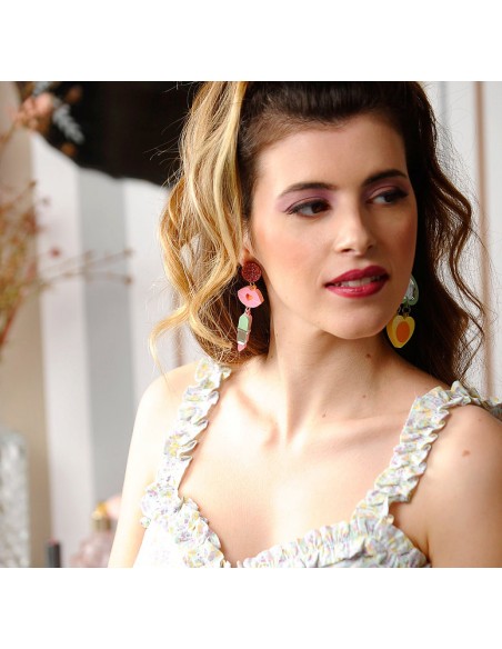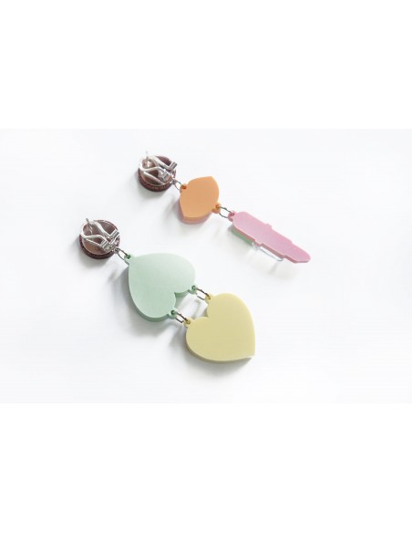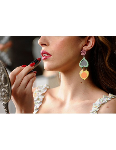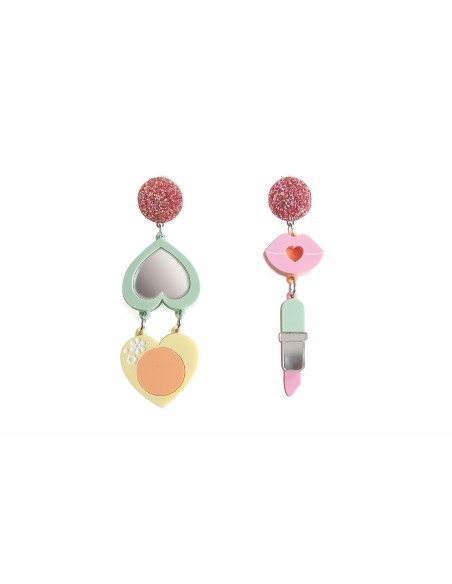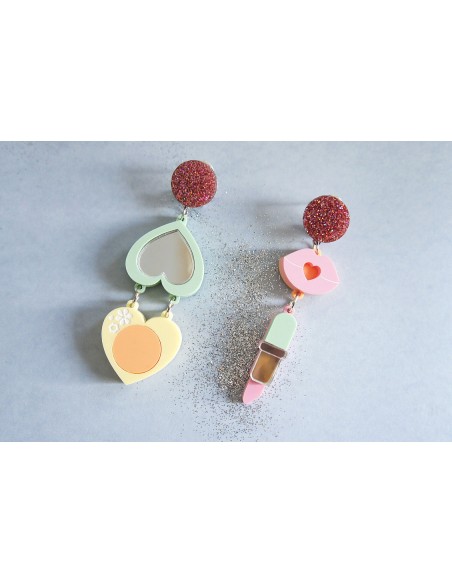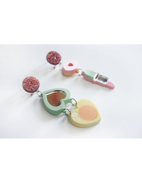 Pendientes con forma de colorete y pintalabios combinados con corazón y labios.