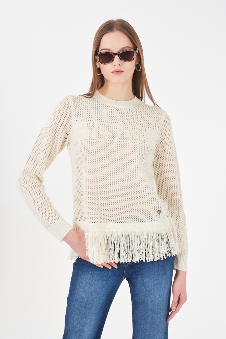 Descubre la elegancia y el estilo desenfadado de nuestro suéter beige con flecos.