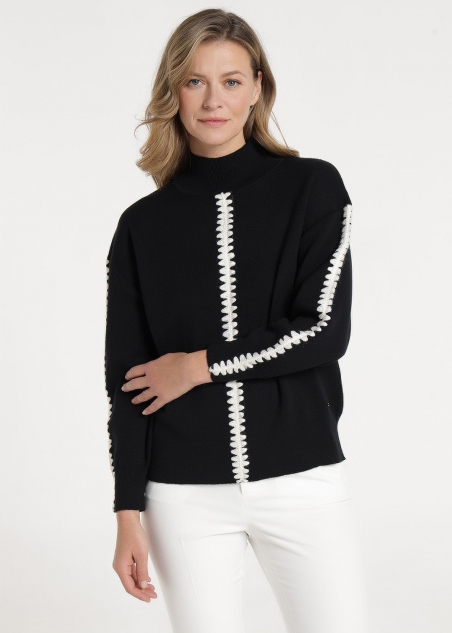 Descubre la elegancia y el estilo atemporal con nuestro suéter negro, adornado con un atractivo detalle en zig zag blanco.