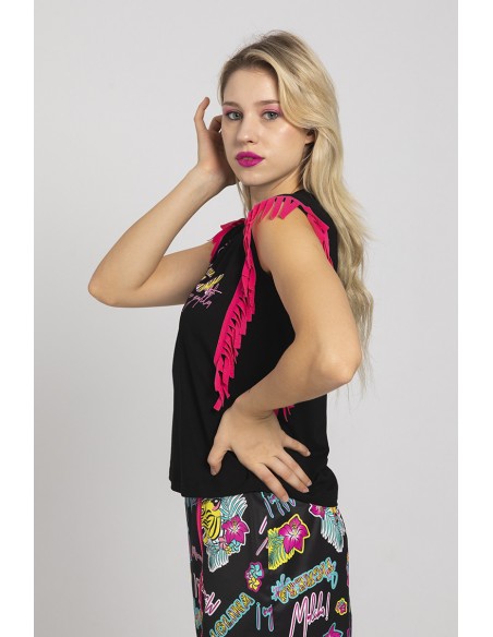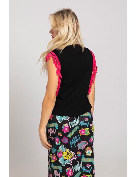 Detalle de flecos laterales en color fucsia.