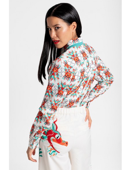 Llamativo estampado con motivos de dragones orientales.