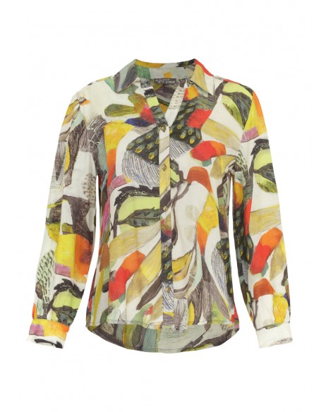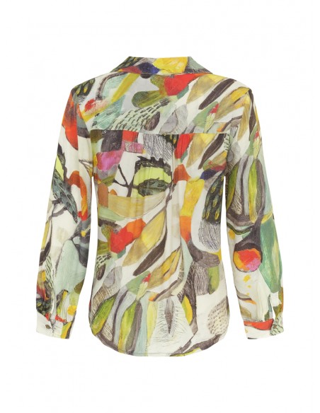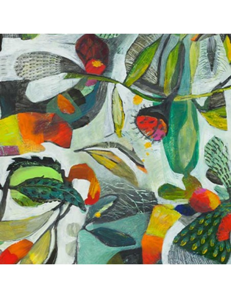 Sus formas florales y vegetales simplificadas se desarrollan a través de capas de colores, texturas y marcas.