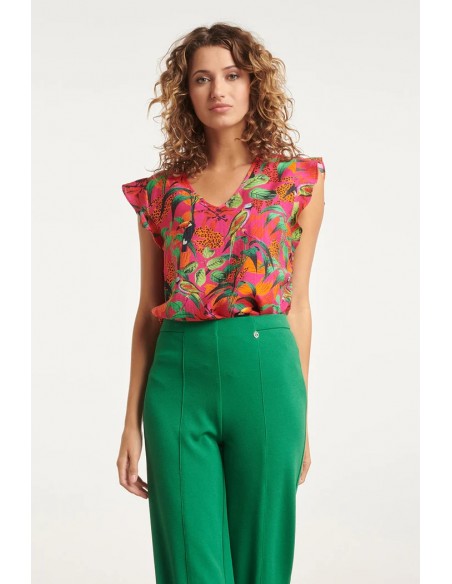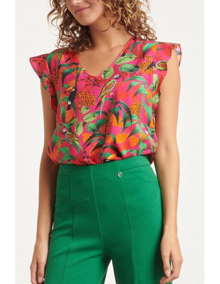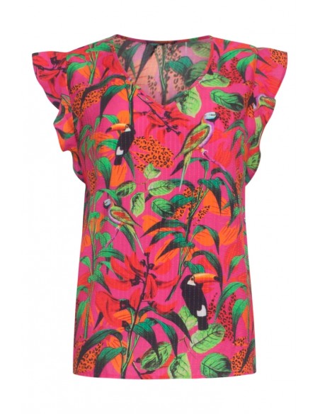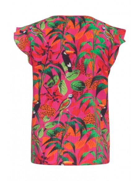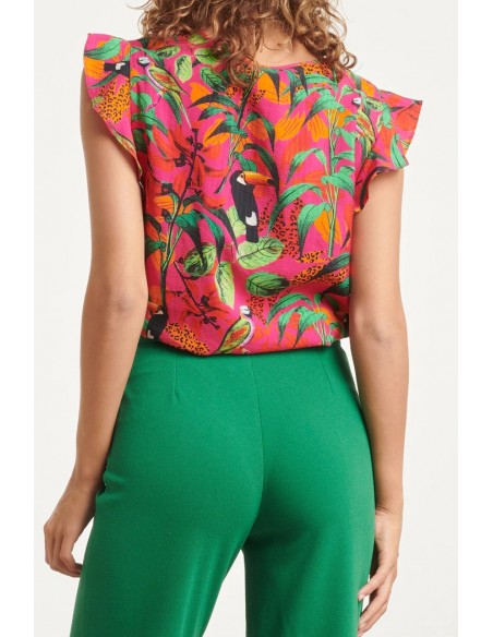 Con un atrevido diseño de estampado tropical que encarna un ambiente selvático con pájaros y gatos salvajes, esta blusa de verano es una opción distintiva para tu guardarropa de verano.