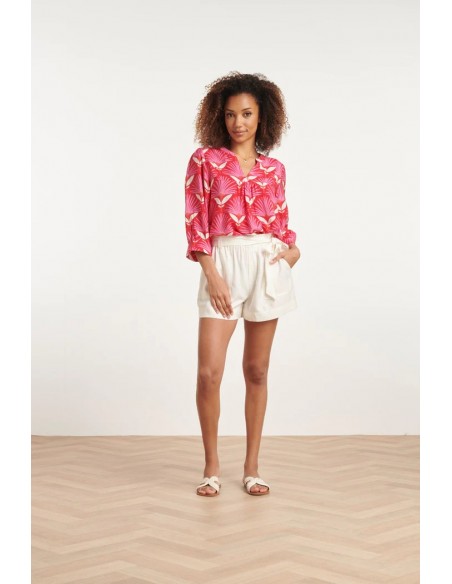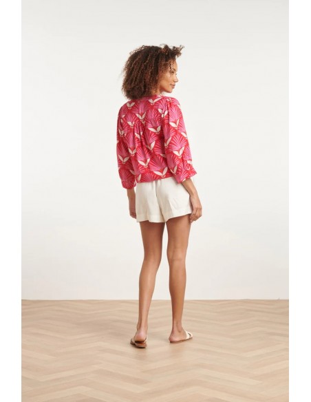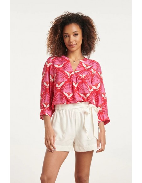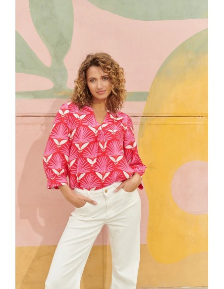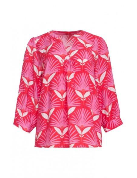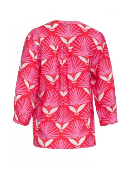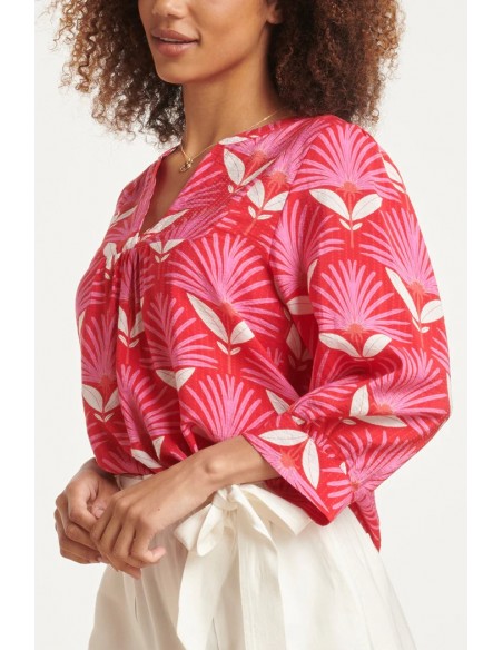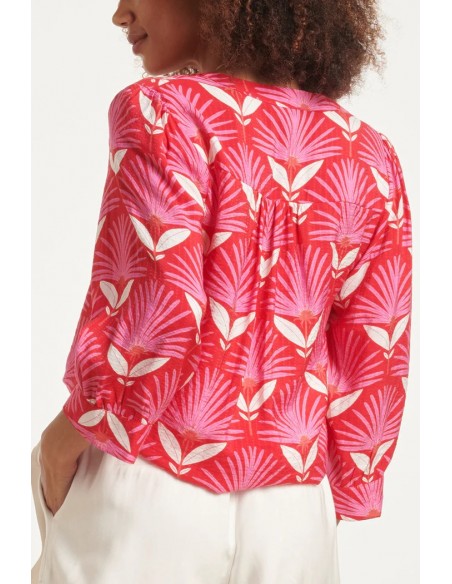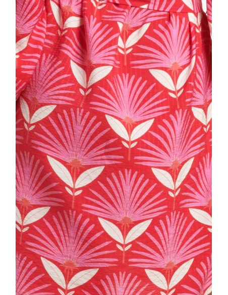 Ilumina tu look de verano con la blusa en estampado floral retro rojo brillante.