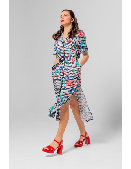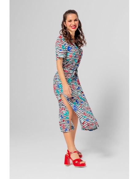 Cierre frontal con botones. Cinturón ajustable en el mismo tejido.