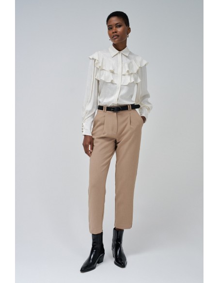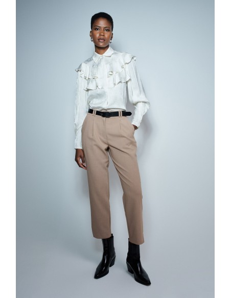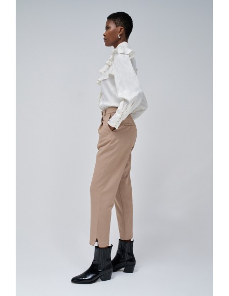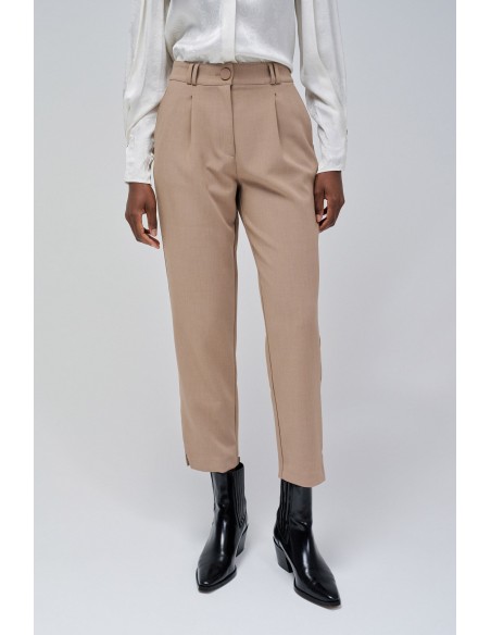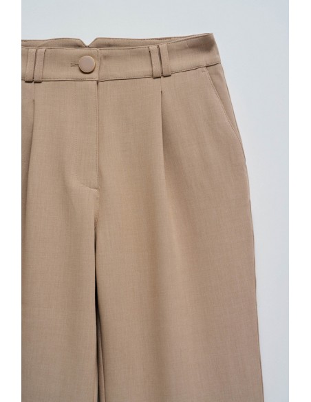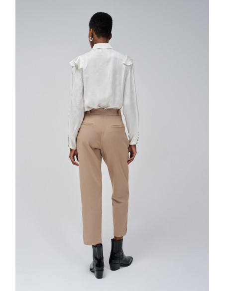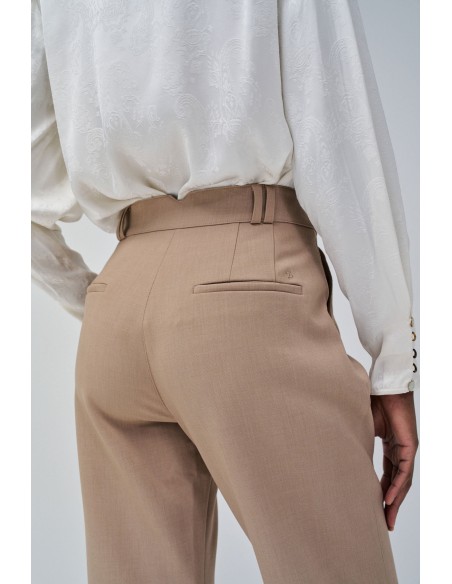 La cintura alta con trabillas y la apertura con cremallera y botón verde proporcionan un acabado sofisticado.