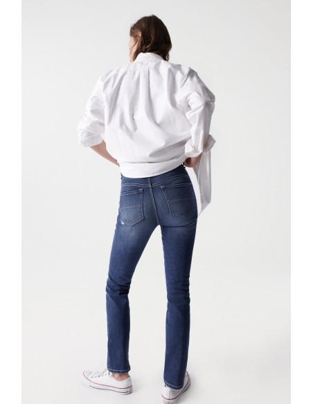 Los vaqueros Push In Secret Glamour con un único botón incorporan un refuerzo interior 360º que crean un efecto vientre plano.