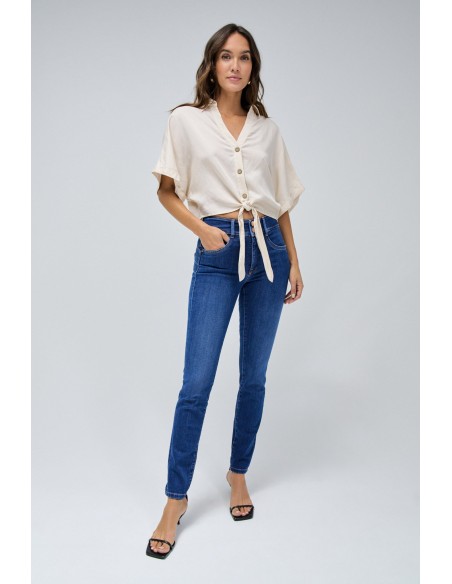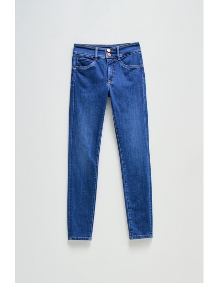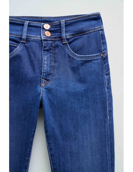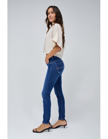 Los vaqueros Secret Push In, de tiro medio y dos botones, incorporan un panel interno, especialmente diseñado para moldear tu cintura con el máximo confort.