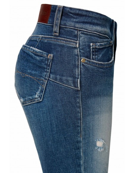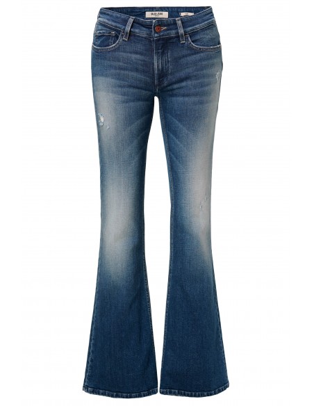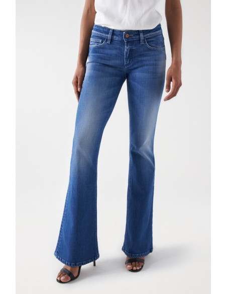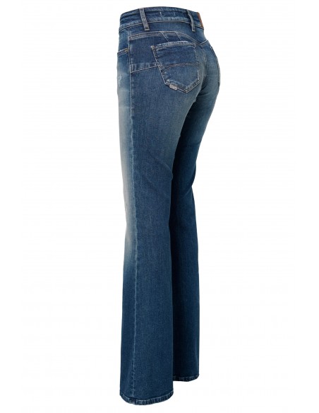 Pierna acampanada flare. Tiro bajo. Cierre con botón y cremallera.