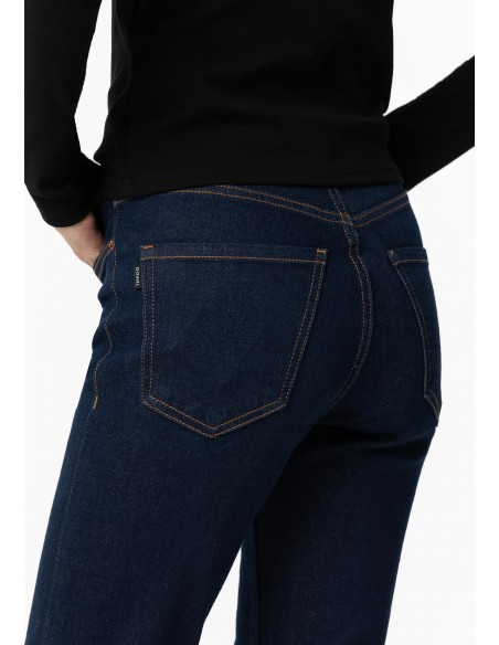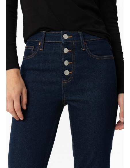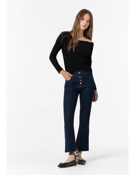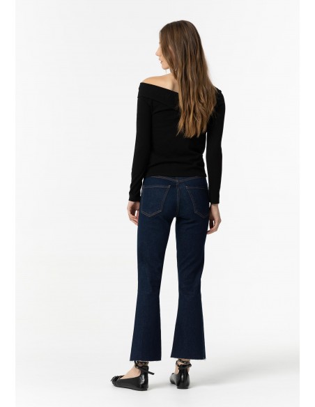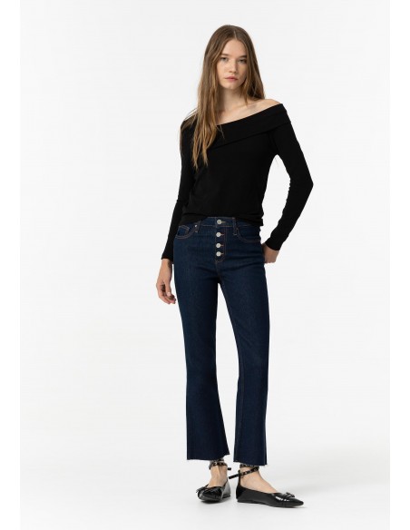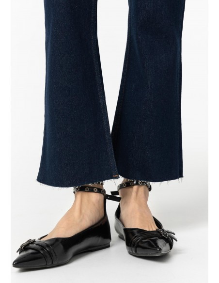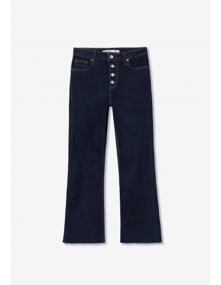 Con cintura alta y cadera ajustada, la pierna de estilo flare añade en el bajo un detalle característico deshilachado.