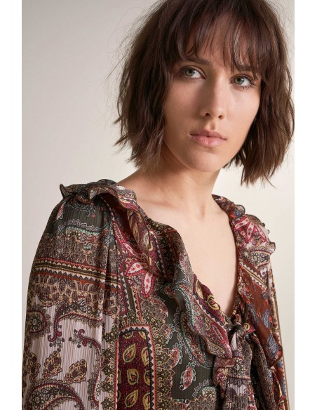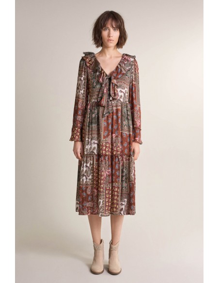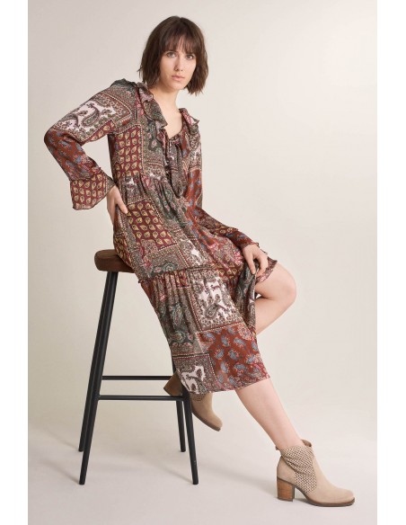 Vestido de manga larga con cuello de pico y estampado motivo paisley.