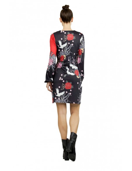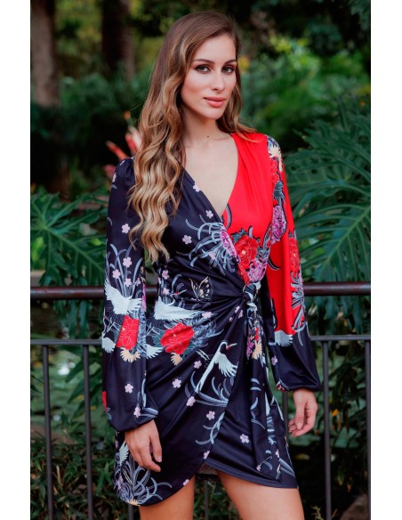 Este vestido negro y rojo con su estampado de flores y grullas es la elección perfecta para destacar en cualquier ocasión.