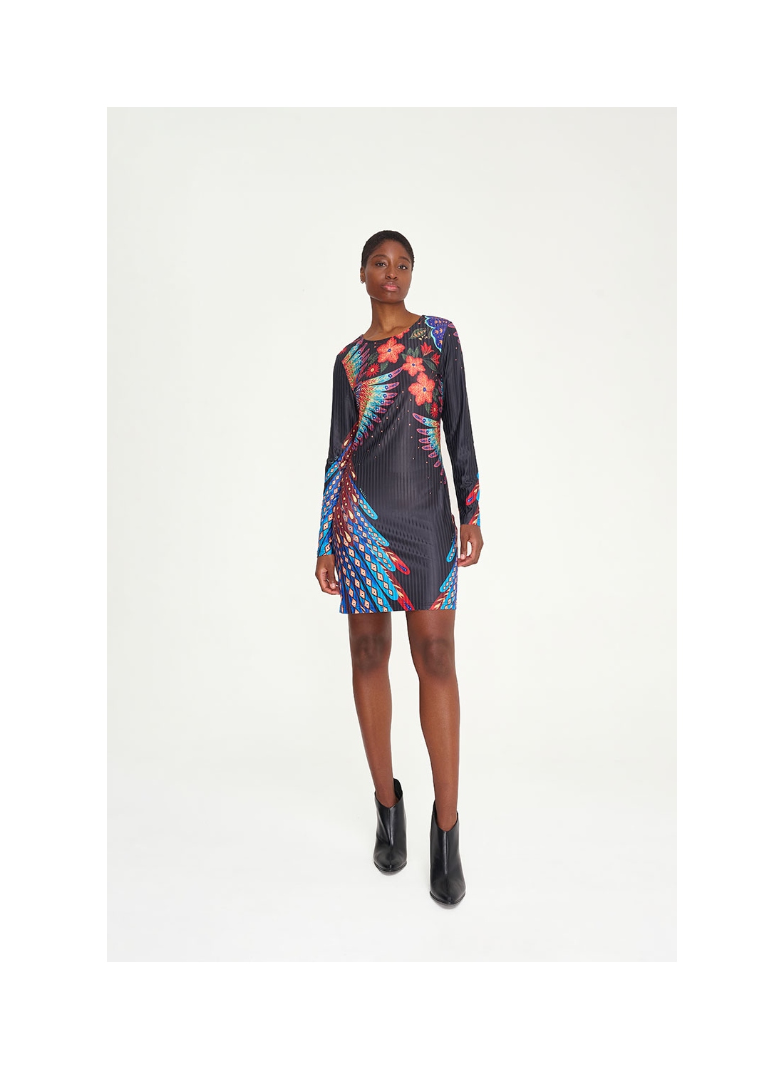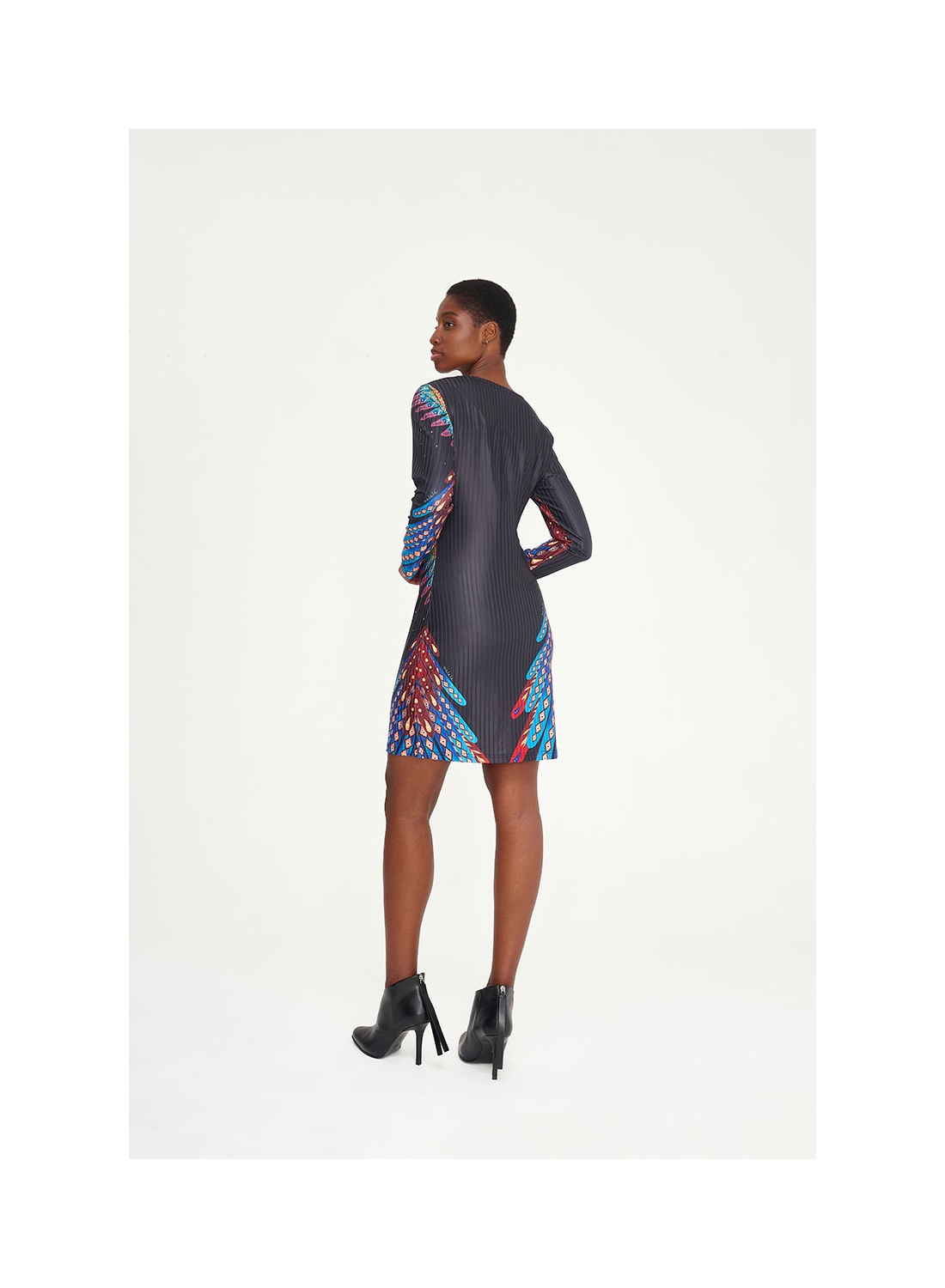 Descubre la elegancia y el estilo con este vestido negro que destaca por su vibrante patrón colorido.