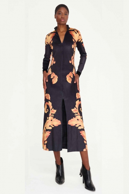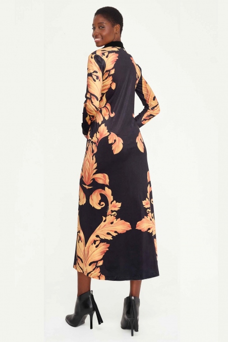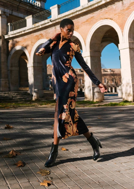Descubre la elegancia y el estilo con nuestro vestido midi negro con estampado de hojas.