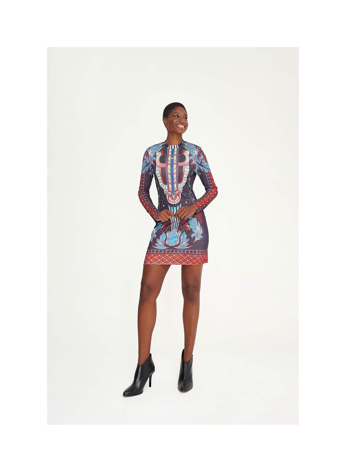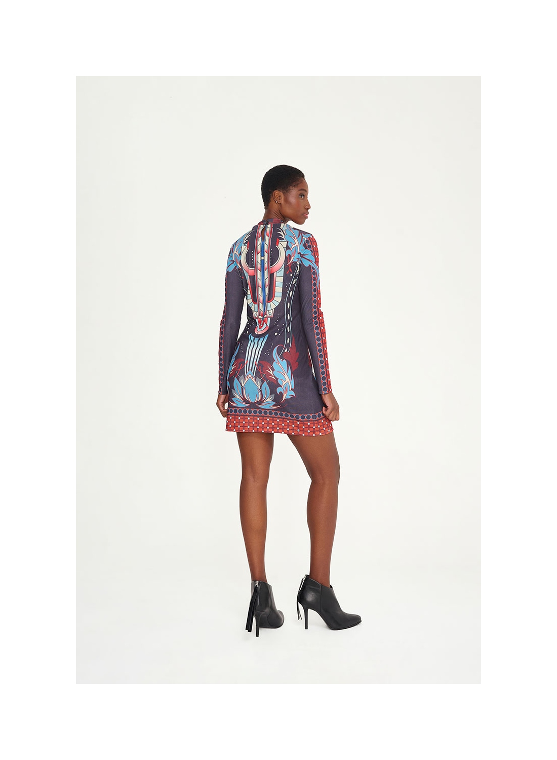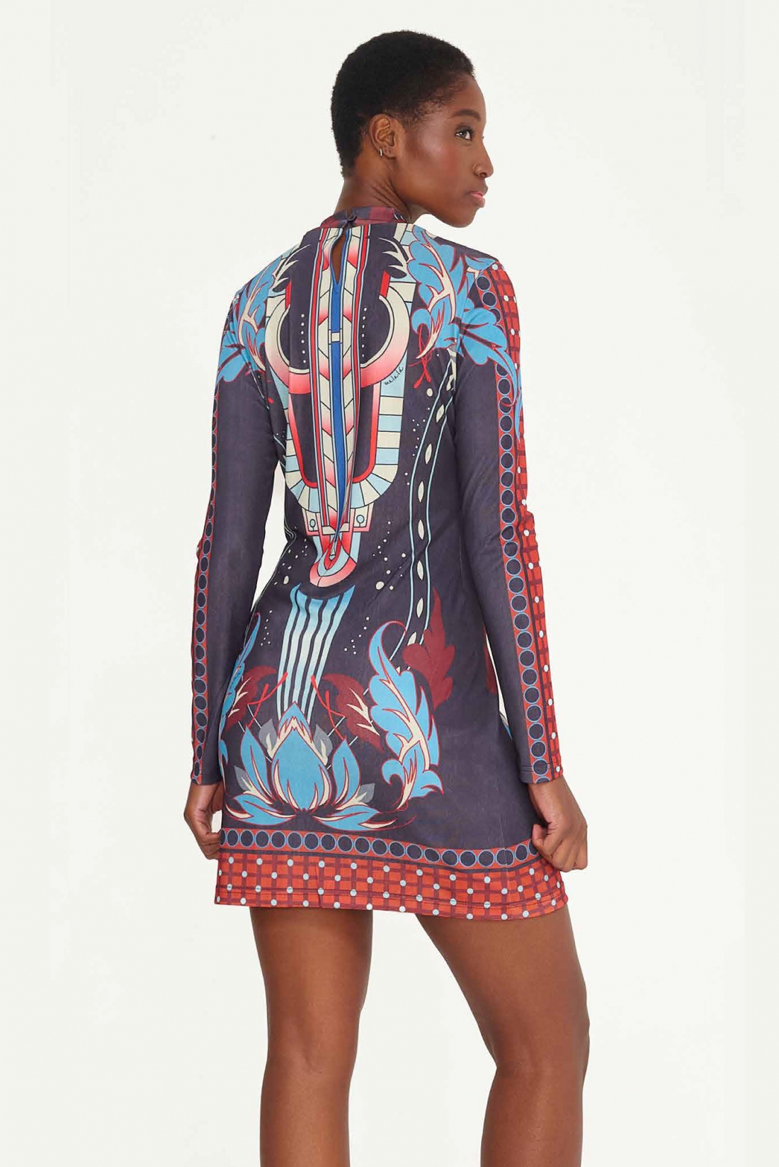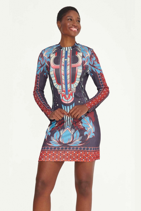 Descubre la elegancia y el estilo vibrante de nuestro vestido colorido con motivos art decó, diseñado para resaltar tu personalidad única.