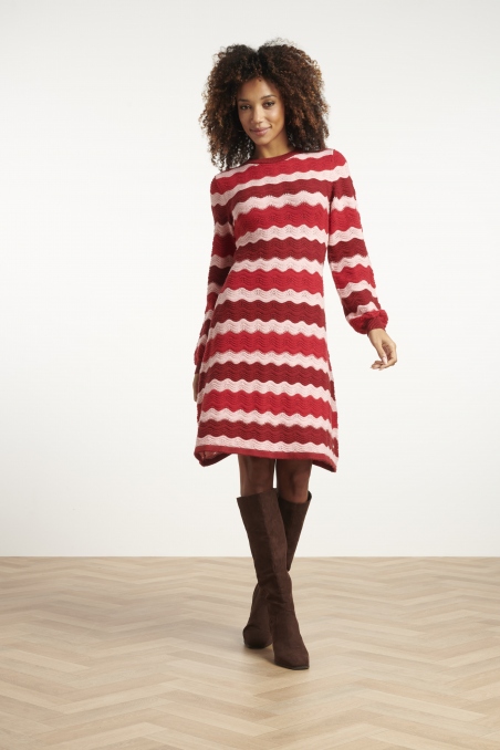 Este encantador vestido de punto a rayas rojas y rosas es la elección perfecta para cualquier ocasión.